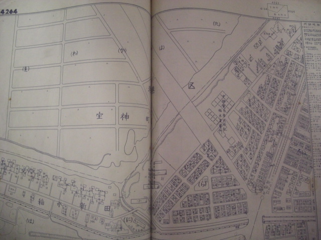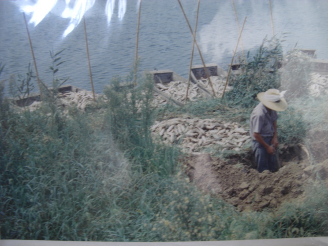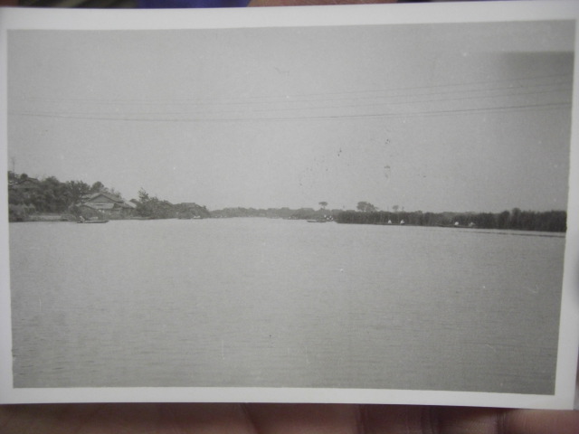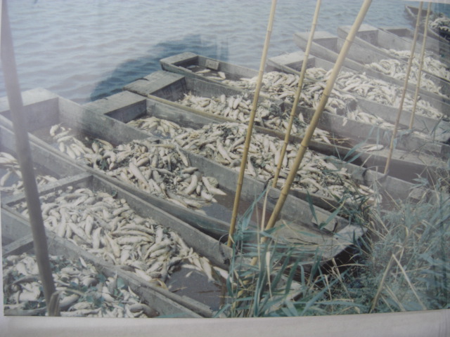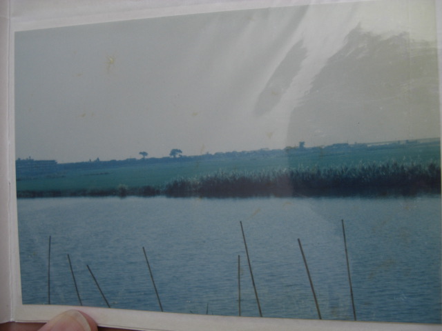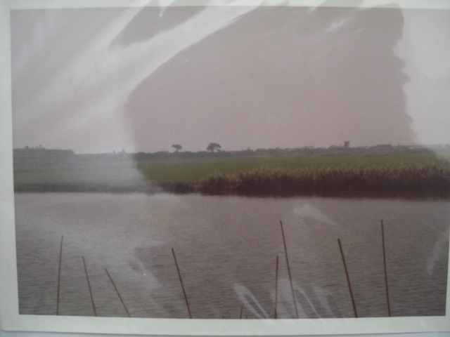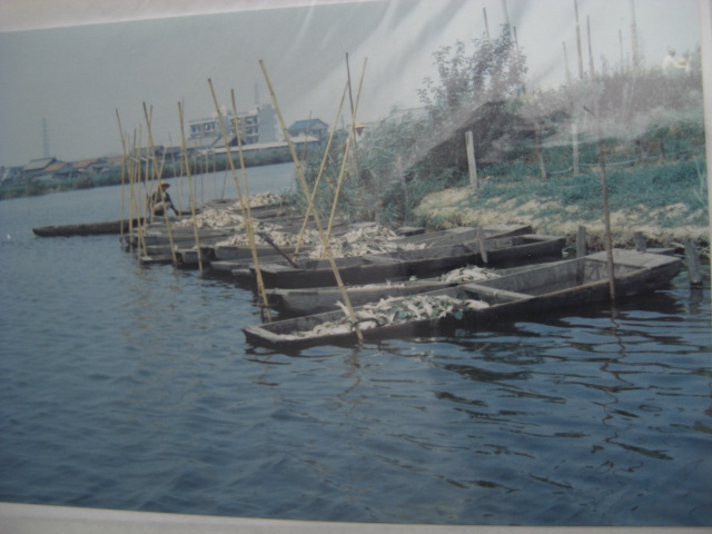 大宮司川です。写真は昭和30年代~40年代の川の様子で、地図は昭和45年のものです。稲永新田と宝神の境目を流れていた大きなため池(用水路)でした。この川では養殖がおこなわれ、また釣堀もありました。稲永新田を開発する時に堤防と灌漑用水が作られて、その用水部分が売り出されたのを当時3家が共同購入したのでした。写真には養殖した魚の死骸が写っておりますが、新田で撒かれた農薬が雨にまじり流れ込み、養殖池の鰡(ぼら)が大量死したときのものです。この被害を当時の保健所に申し立てましたが水稲優先のため取り合ってくれなかったために、岸辺の所有地に埋めたそうです。